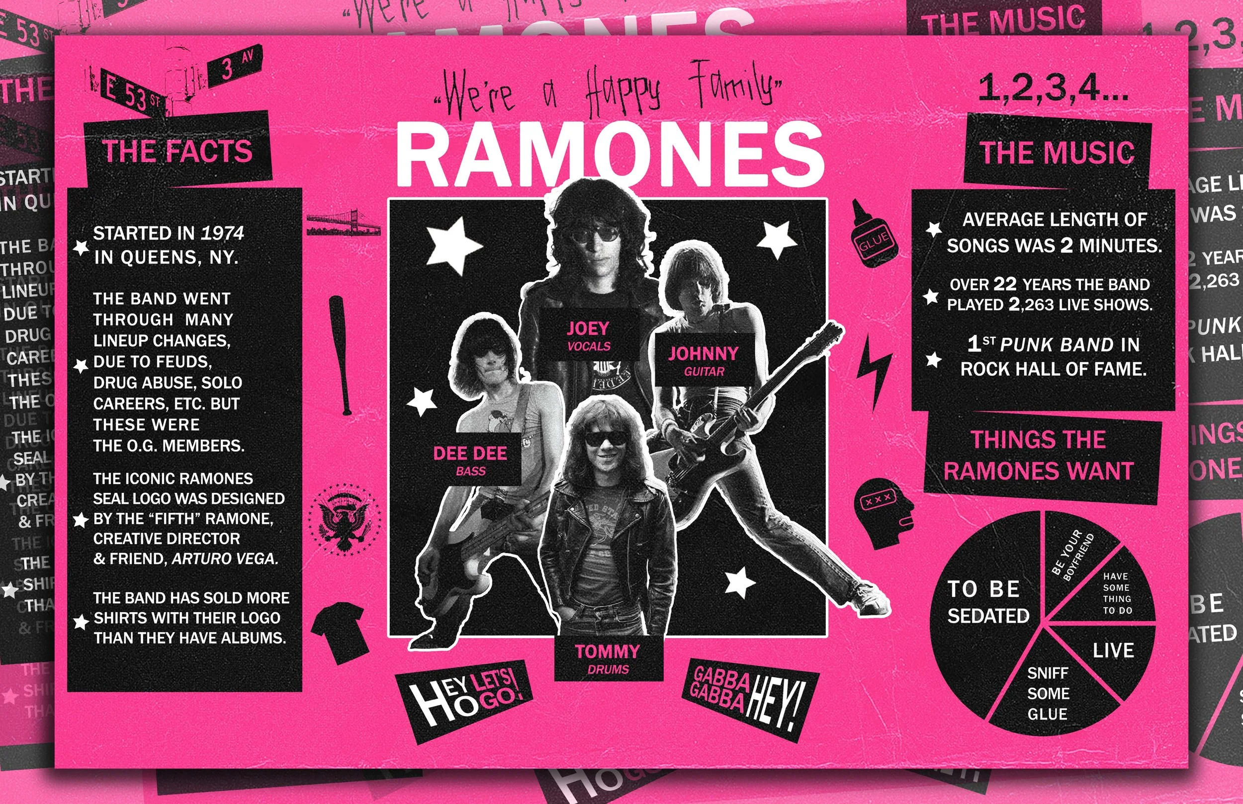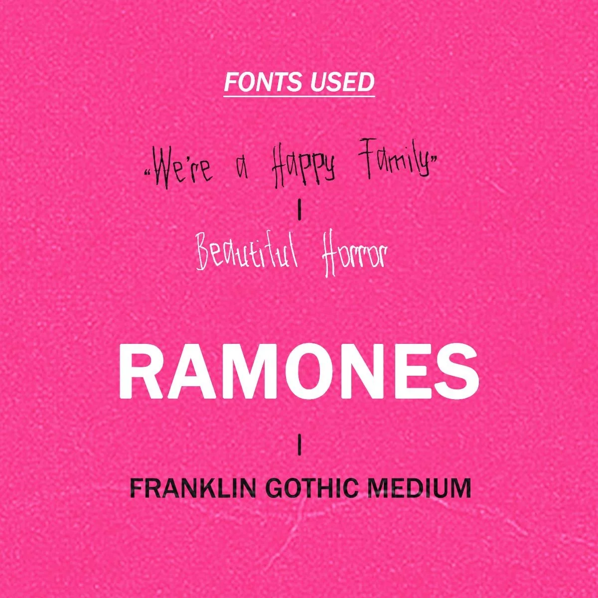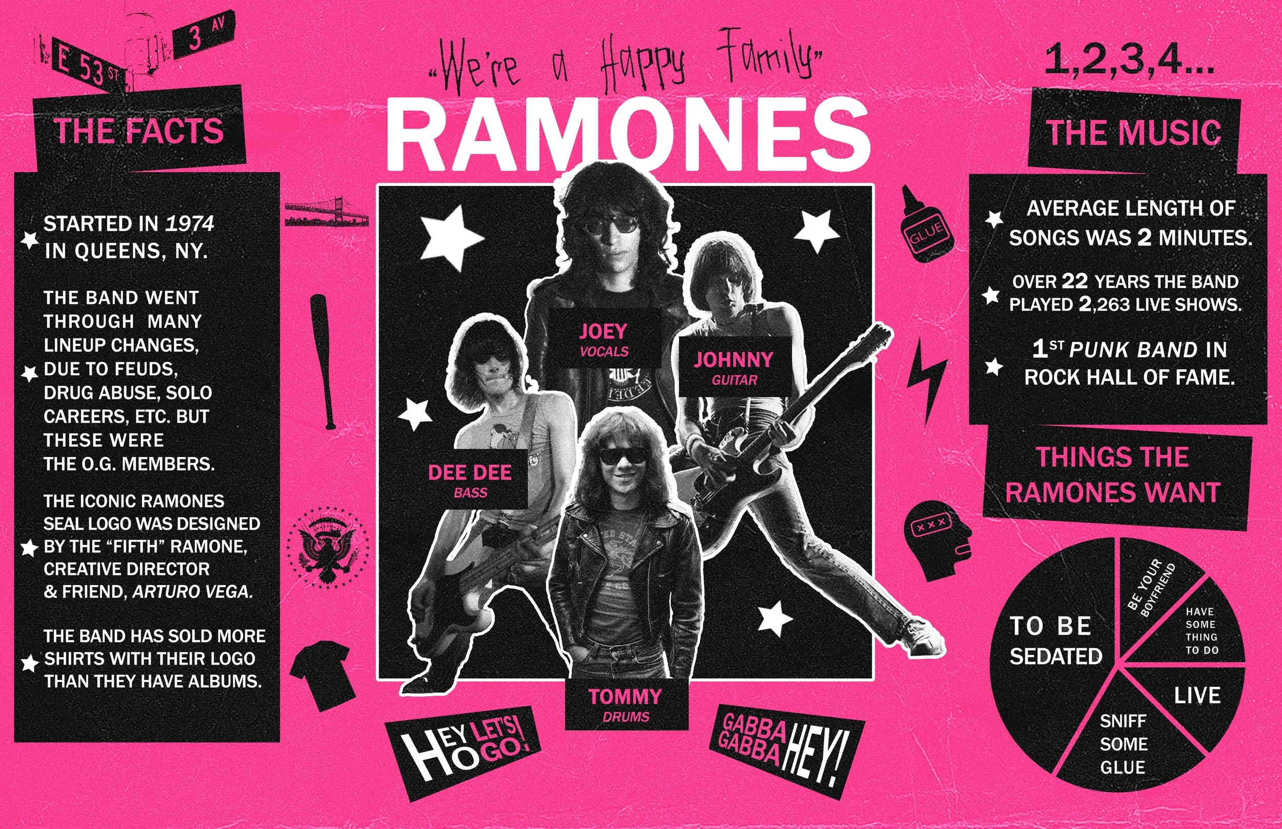 The RAMONES are one of my all time favorite bands. When I first started on my graphic design pathway, I made the original version of this infographic for a Typography class. It was titled: “Wear a RAMONES Shirt Without Looking Like a Poser.” I recently revisited this project, and gave it a facelift. I made some stylistic choices, but still used all the same colors, a palette inspired by the band’s second album Rocket to Russia, and kept all the original information. The result is this bad ass Punk Poster! So “Let’s Rock n Roll with the RAMONES.”